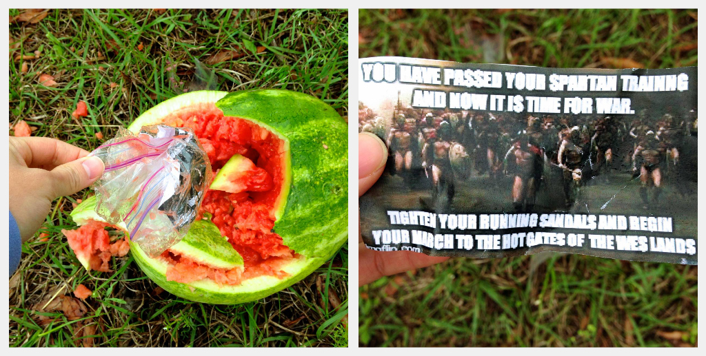 After breakfast, we geared up with snacks and drove to Memorial Park. There, I received my “Spartan Training”. Aka throwing a spear at a watermelon in an open field with bluebonnets nearby.